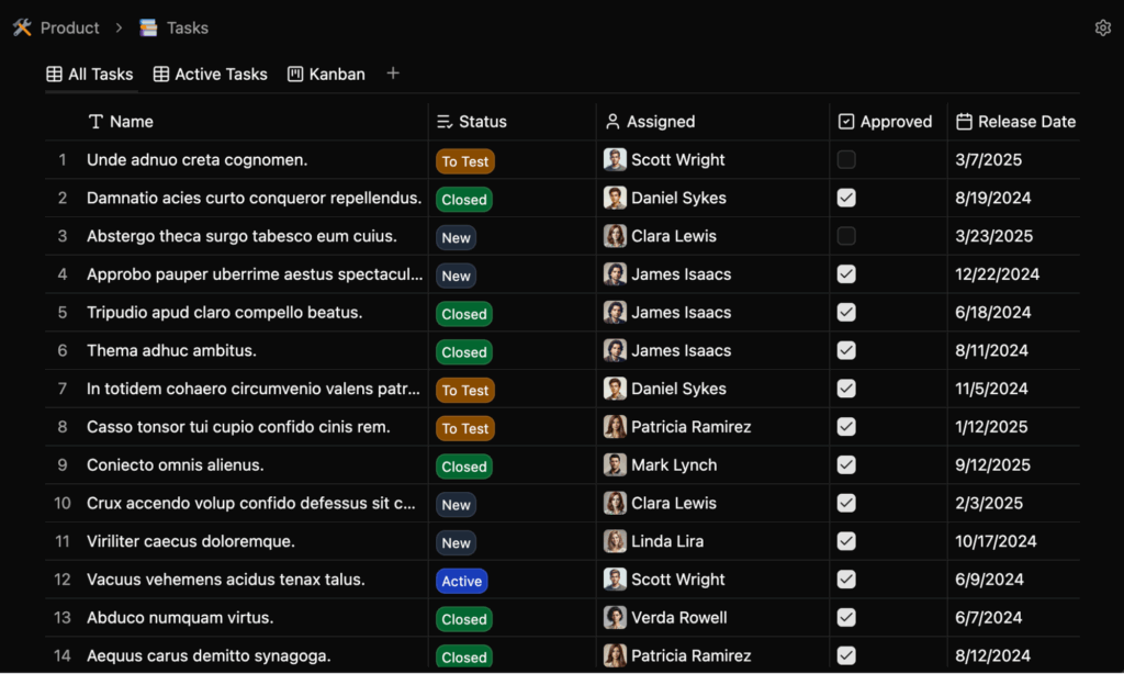 - Cơ sở dữ liệu tuỳ chỉnh: Tổ chức thông tin với các trường tuỳ chỉnh, hỗ trợ nhiều góc nhìn (bảng, kanban, lịch)