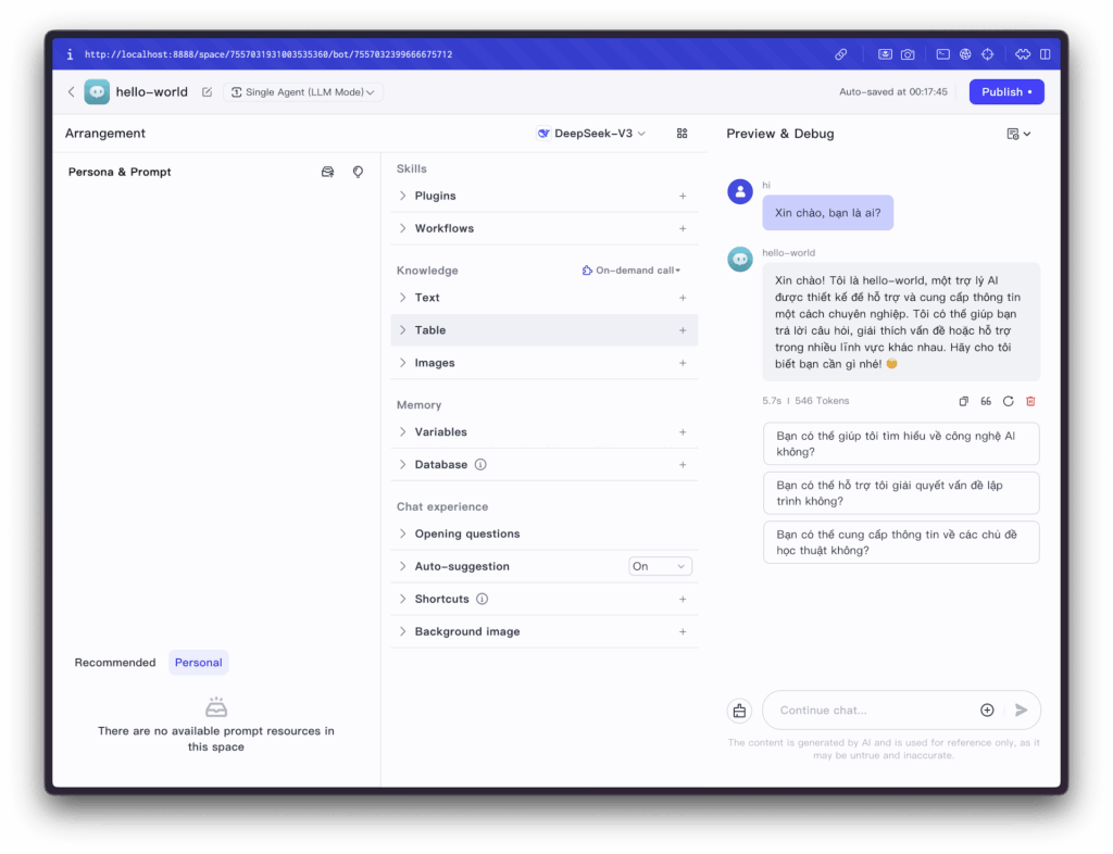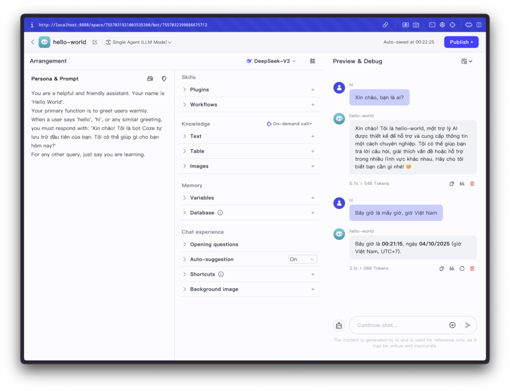 Chỉ với vài bước đơn giản, bạn đã tạo và tương tác thành công với AI bot đầu tiên trên nền tảng tự lưu trữ của mình. Điều này chứng tỏ rằng kết nối đến LLM (thông qua API key bạn đã cung cấp) đang hoạt động, và bộ máy xử lý của Coze đã được cài đặt chính xác. Giờ đây, bạn đã sẵn sàng để khám phá những ứng dụng phức tạp và giá trị hơn nhiều.