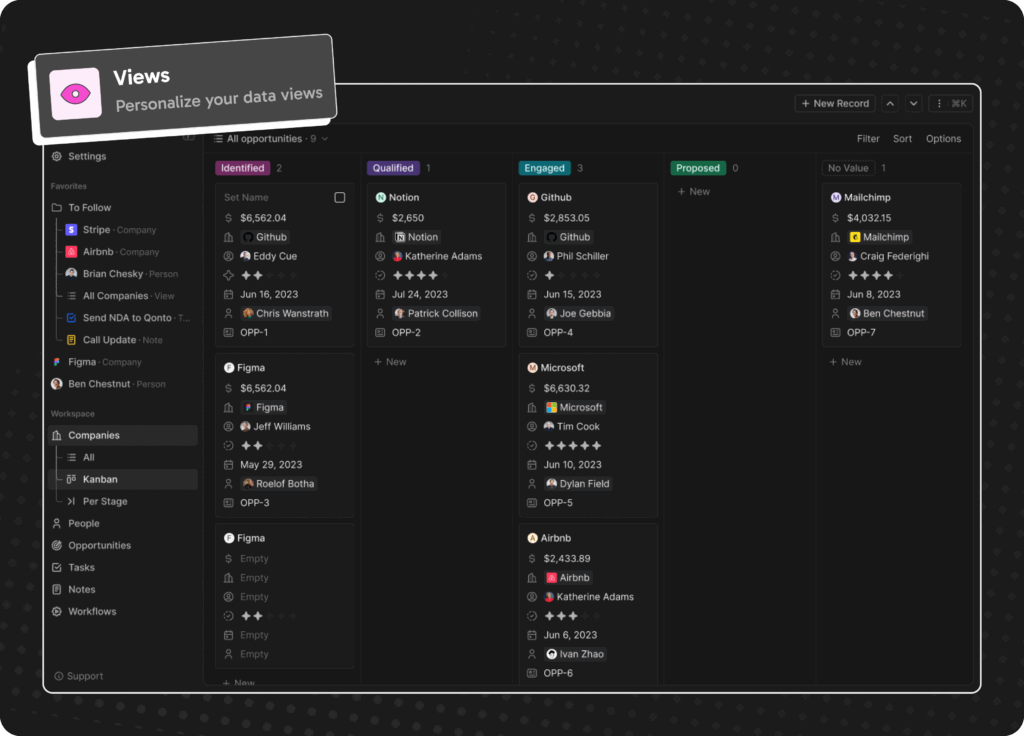 Twenty học hỏi từ những sai lầm của các CRM cũ và tạo ra trải nghiệm liền mạch lấy cảm hứng từ các công cụ hiện đại như Notion, Airtable và Linear. Giao diện tối giản, thân thiện với người mới bắt đầu, kết hợp phím tắt và khả năng tìm kiếm mạnh mẽ giúp tăng hiệu suất làm việc.