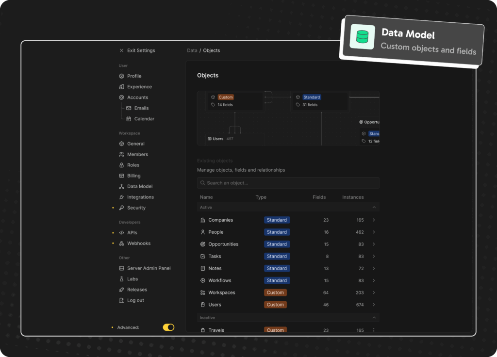 Twenty cho phép bạn tùy biến hoàn toàn cấu trúc dữ liệu theo nhu cầu doanh nghiệp. Bạn có thể tạo các custom objects (đối tượng tùy chỉnh), thêm/bớt fields (trường thông tin), và thiết lập mối quan hệ giữa các đối tượng một cách linh hoạt.