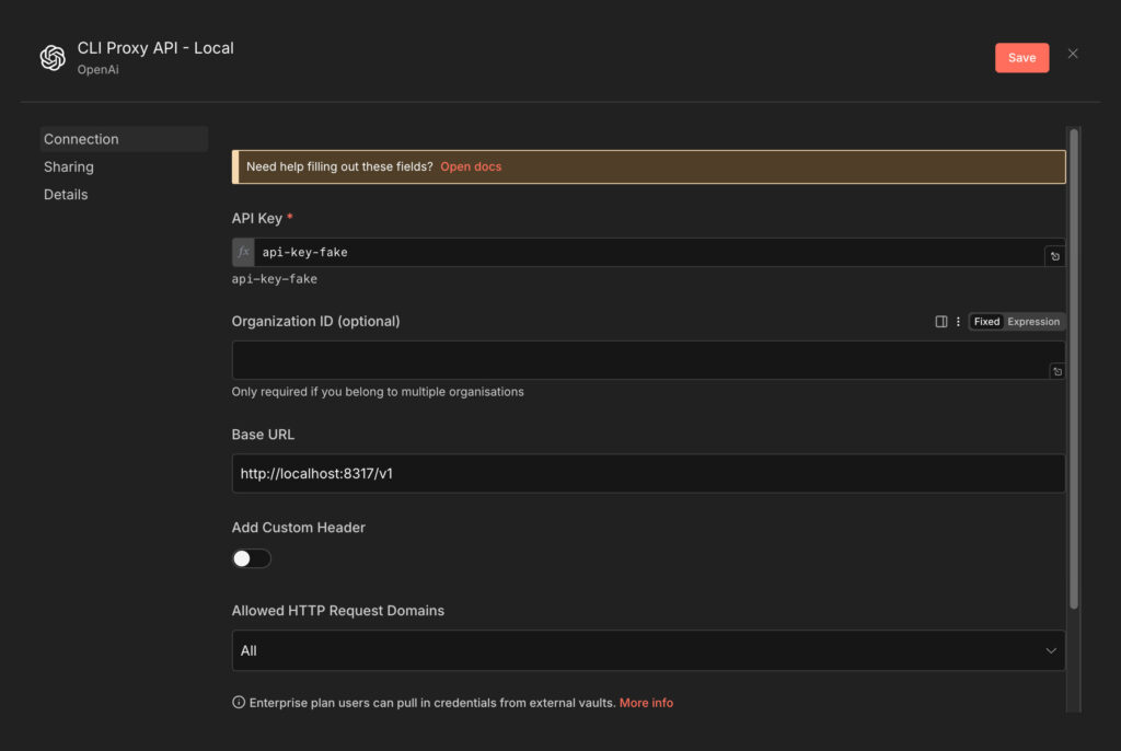 http://cli-proxy-api:8317/v1/chat/completions- Lưu ý: Nếu n8n chạy cùng Docker network thì dùng tên service