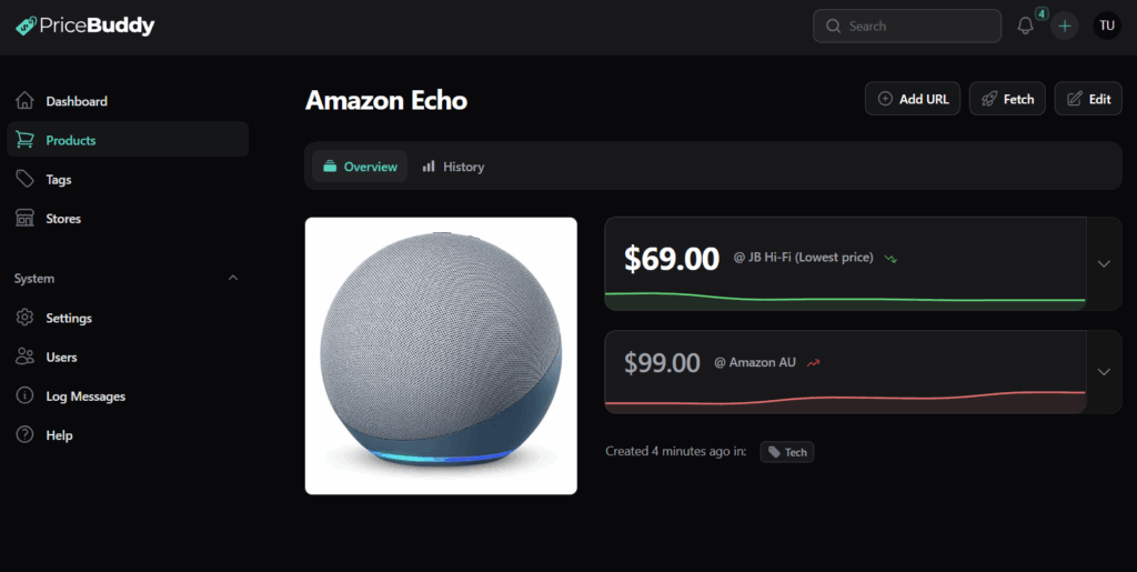 Thêm cùng một sản phẩm từ nhiều cửa hàng (Amazon, eBay, Shopee, Tiki, v.v.) và so sánh giá theo thời gian. PriceBuddy tự động phát hiện cửa hàng phổ biến, nhưng bạn cũng có thể thêm cửa hàng tùy chỉnh bằng CSS selector, regex hoặc JSONPath.