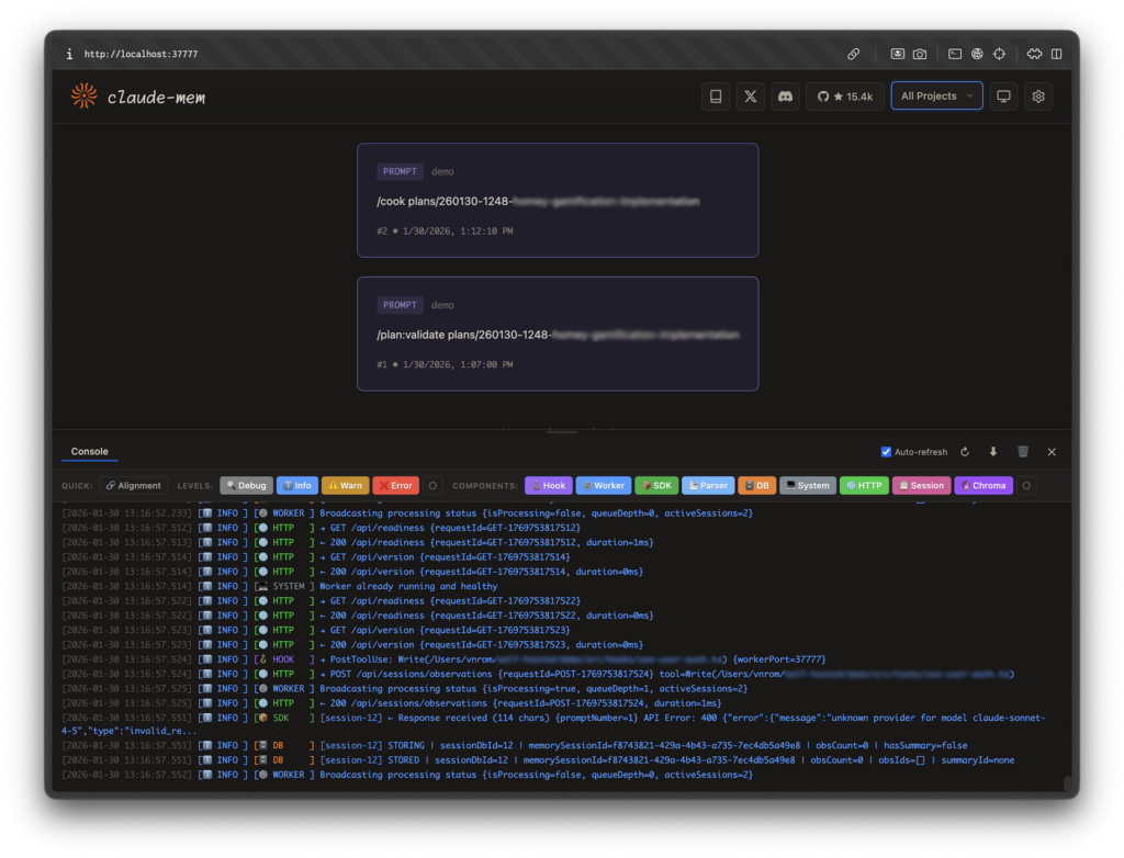 http://localhost:37777) để kiểm tra trực quan dòng thời gian bộ nhớ. Điều này cho phép bạn kiểm tra chính xác những gì AI đã ghi lại liên quan đến lịch sử kho lưu trữ của bạn.