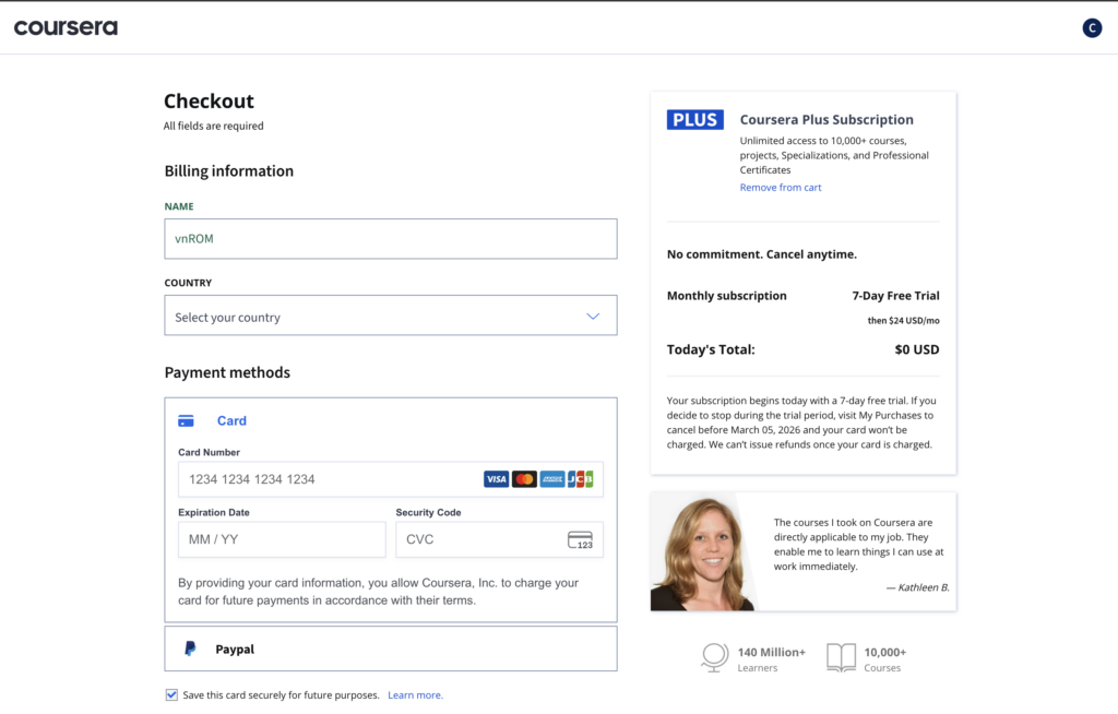 Bước 1: Đăng ký tài khoản và kích hoạt dùng thử Coursera (7 ngày)