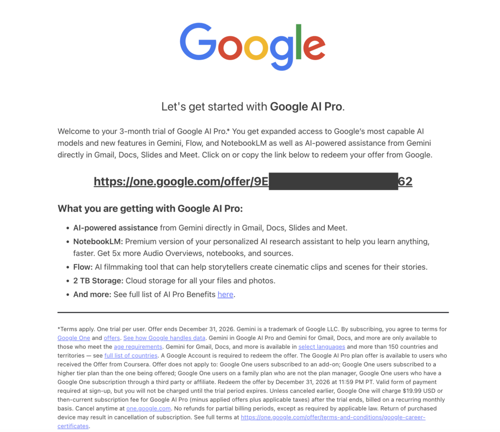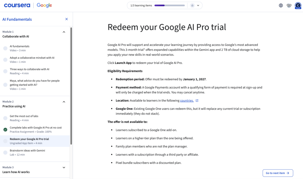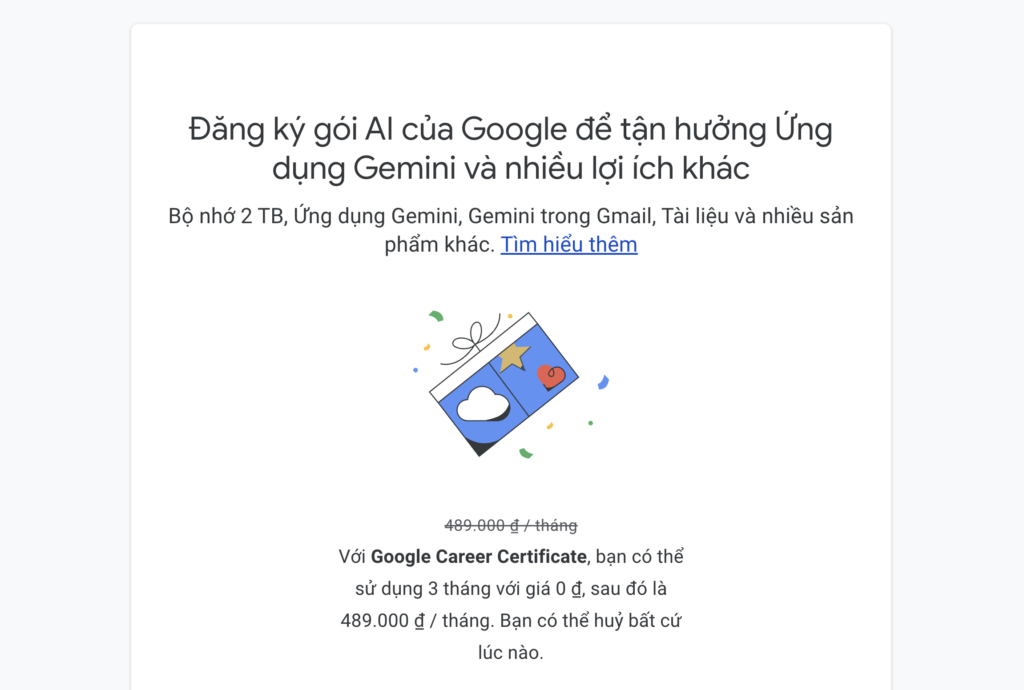 Hiện tại, thông qua khóa học “AI Fundamentals” của Google trên nền tảng Coursera, bạn có thể nhận được đặc quyền dùng thử 3 tháng Google AI Pro hoàn toàn miễn phí. Gói này cung cấp cho bạn quyền truy cập vào các mô hình AI mới nhất của Google (Gemini) và 2TB dung lượng lưu trữ.