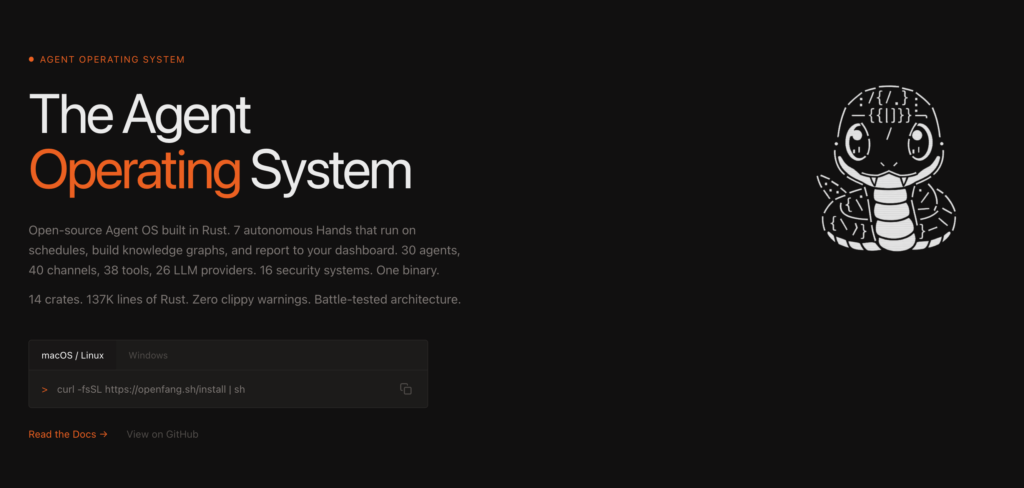 OpenFang là hệ điều hành dành riêng cho các agent AI, được xây dựng hoàn toàn bằng ngôn ngữ Rust và phát hành mã nguồn mở dưới giấy phép MIT. Khác biệt hoàn toàn với các framework chatbot hay orchestrator đa agent thông thường, OpenFang biến máy tính của bạn thành một hệ điều hành thực thụ nơi các agent hoạt động độc lập, chạy theo lịch trình 24/7 mà không cần bạn phải gõ lệnh liên tục.