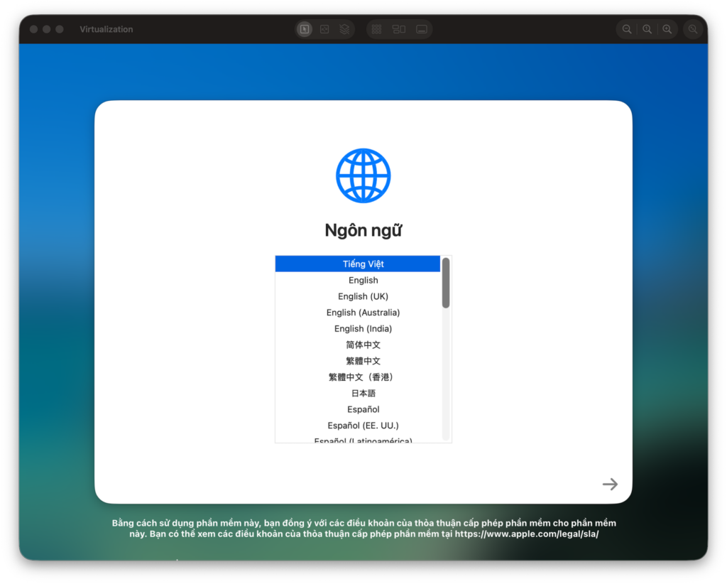 lume run openclawMột cửa sổ màn hình VNC sẽ hiện lên. Bạn hãy thực hiện các thao tác thiết lập macOS thông thường: chọn ngôn ngữ, tạo tài khoản người dùng (nhớ kỹ Username và Password), và có thể bỏ qua bước đăng nhập Apple ID nếu chưa cần thiết.