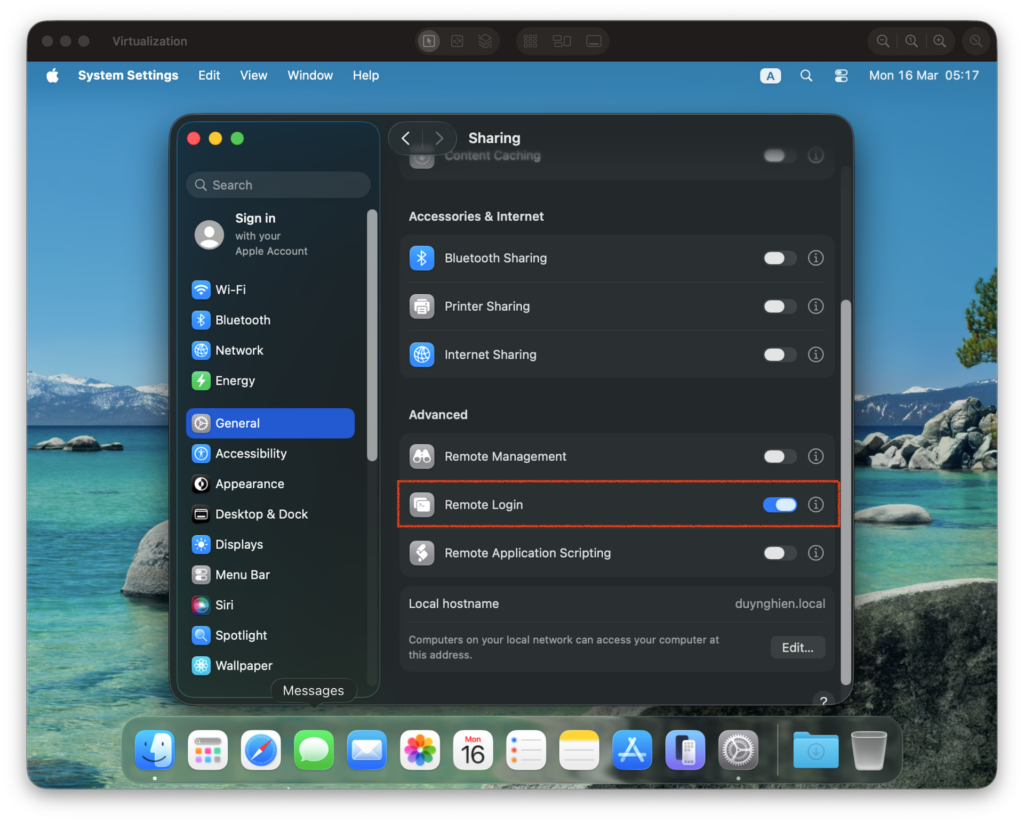 Để chạy máy ảo ngầm và điều khiển nó qua Terminal, bạn cần bật SSH trên máy ảo macOS:
