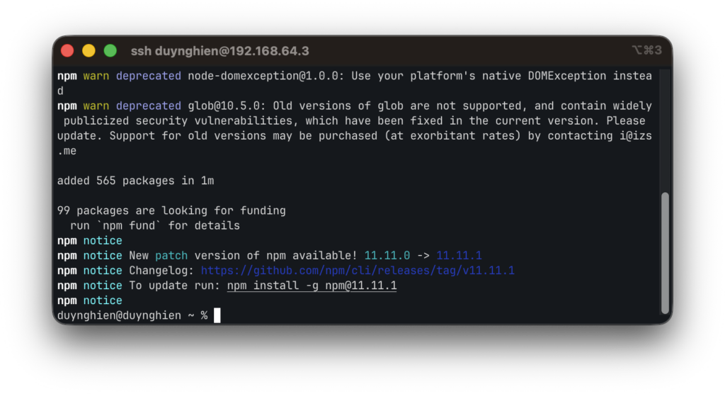 ssh <username_cua_ban>@<IP_may_ao>Bước 6: Cài đặt môi trường Node.js