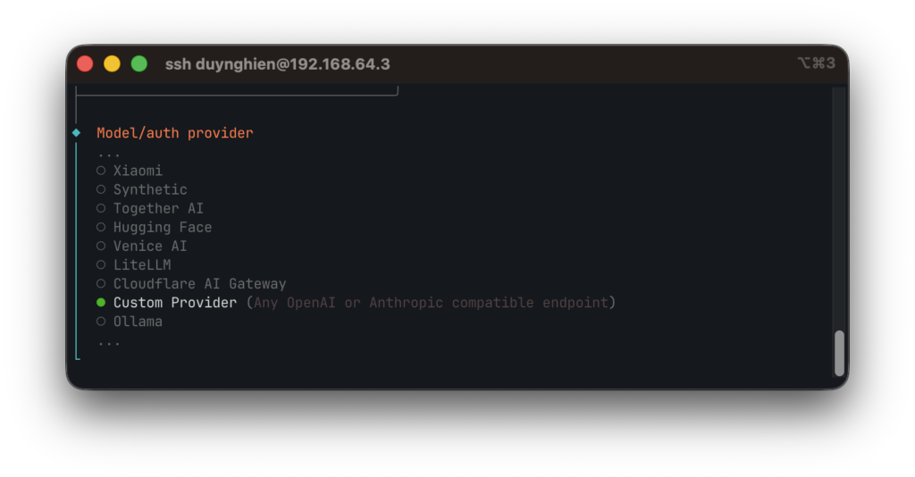 openclaw onboard --install-daemonLệnh này sẽ hiển thị một giao diện hướng dẫn từng bước. Bạn sẽ được hỏi để chọn nhà cung cấp mô hình AI (ví dụ: Anthropic, OpenAI, Custom Provider) và yêu cầu nhập API Key tương ứng.