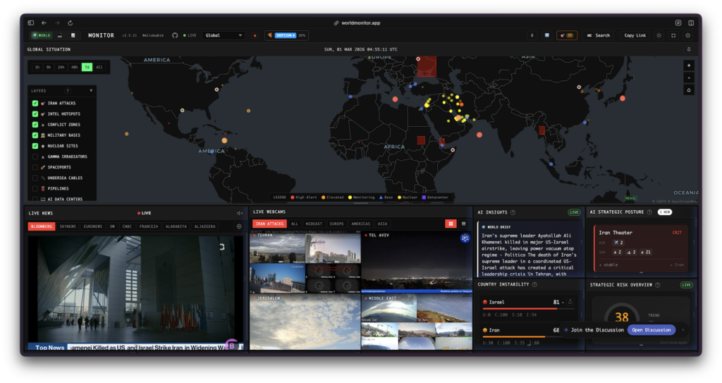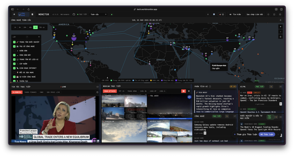 World Monitor là một dashboard tình báo toàn cầu “thời gian thực”, hoàn toàn mã nguồn mở, được xây dựng bởi Elie Habib. Dự án tổng hợp hơn 150 nguồn tin tức, dữ liệu địa chính trị, theo dõi quân sự và hàng hải, giám sát cơ sở hạ tầng chiến lược, cùng tín hiệu thị trường tài chính vào một giao diện duy nhất được tăng cường bởi trí tuệ nhân tạo.