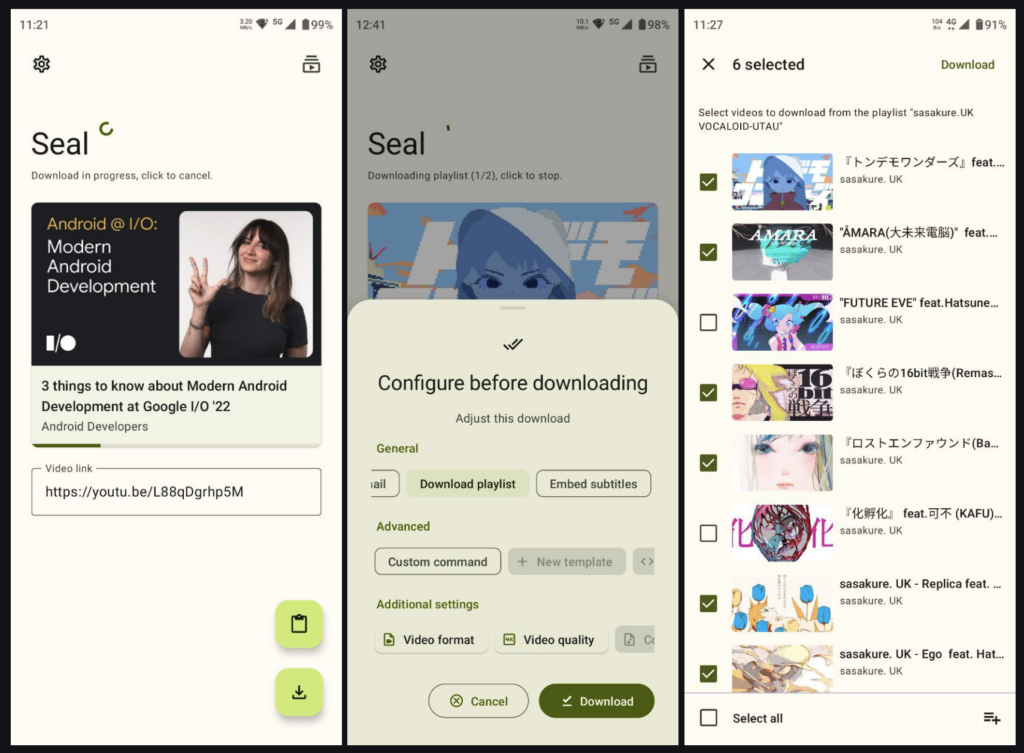 Seal là lựa chọn cực hay cho Android nếu bạn muốn sức mạnh của yt-dlp nhưng không muốn làm việc với dòng lệnh. Ứng dụng này là GUI cho yt-dlp trên Android, hỗ trợ tải video/audio từ các nền tảng mà yt-dlp tương thích, nhúng metadata và thumbnail, tải playlist chỉ với một chạm, dùng aria2c, nhúng phụ đề, và quản lý lệnh tùy chỉnh. Giao diện Material Design 3 cũng giúp Seal thân thiện hơn đáng kể so với tưởng tượng của nhiều người về một app “cho dân kỹ thuật”.