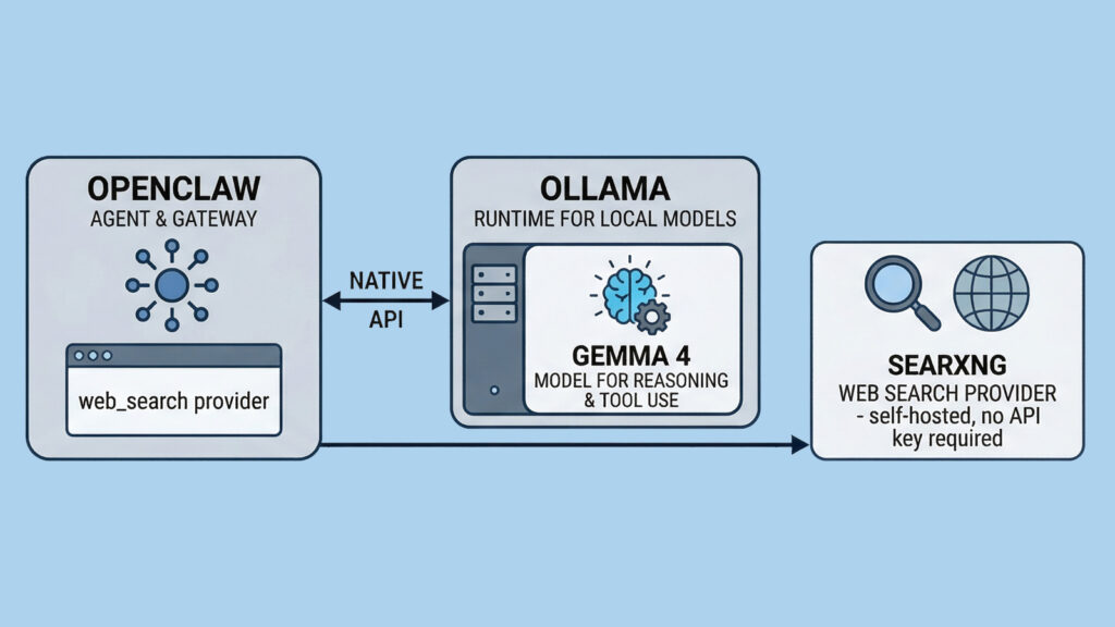 Có thể hình dung đơn giản như sau: OpenClaw là lớp agent và gateway, Ollama là runtime để chạy model local, Gemma 4 là họ model dùng để suy luận và gọi công cụ, còn SearXNG là công cụ tìm kiếm web tự host. OpenClaw hiện tích hợp trực tiếp với Ollama qua native API và hỗ trợ SearXNG như một web_search provider không cần API key.