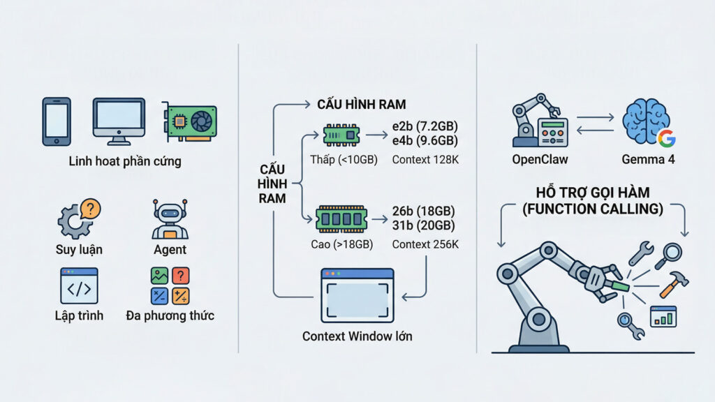 Một điểm quan trọng khác là Gemma 4 có hỗ trợ function calling trong model card chính thức. Đây là yếu tố rất quan trọng với OpenClaw, vì agent không chỉ cần trả lời văn bản mà còn phải biết gọi tool đúng lúc để thực hiện chuỗi thao tác nhiều bước.