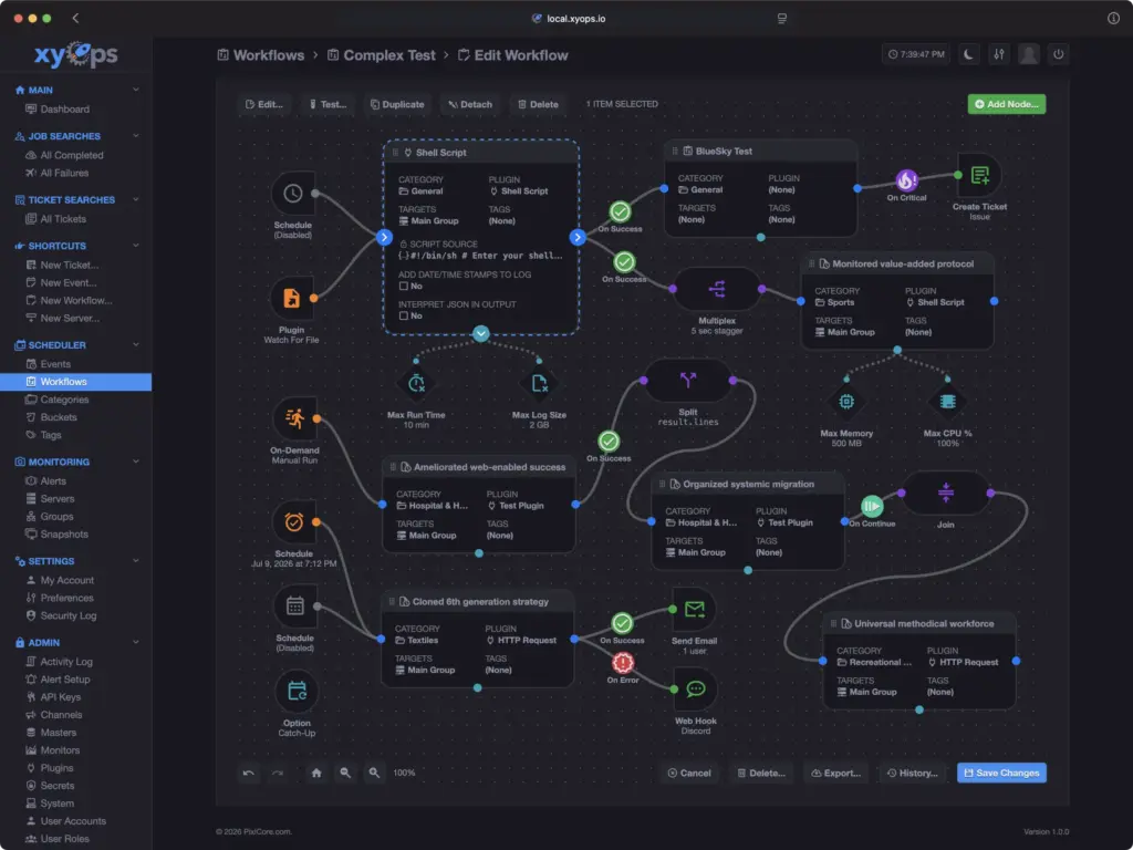 Workflow trong xyOps là một đồ thị trực quan gồm trigger node, event node, job node, action node, limit node và các controller như Split, Join, Repeat, Multiplex, Decision, Wait. Khi trigger kích hoạt, các node nối từ đó sẽ chạy song song theo mặc định; sub-job được sinh ra, kết quả của chúng quyết định wire nào tiếp tục được kích hoạt. Đây là một mô hình orchestration rất hợp cho các tình huống fan-out xử lý song song, nhiều target server, loop, join dữ liệu và điều phối hậu xử lý.