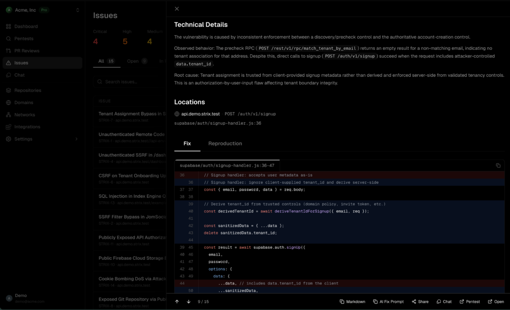 Strix cũng nhấn mạnh năng lực autofix và reporting. Ở cấp nền tảng, sản phẩm hướng tới quy trình từ finding đến fix: phát hiện lỗi, xác nhận exploitability, sinh bản vá, rồi retest để chắc chắn lỗ hổng đã biến mất. Với các team phát triển, đây là mảnh ghép quan trọng vì giá trị thật sự không nằm ở báo cáo dài bao nhiêu trang, mà ở việc issue có được sửa nhanh, review dễ và merge an toàn hay không.
